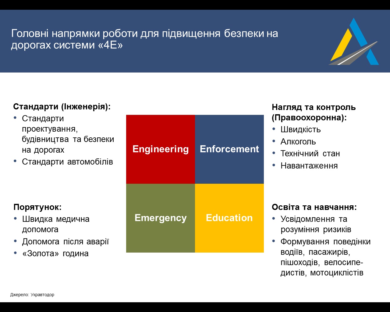 В Укравтодоре предложили программу «4Е», которая, в соответствии с рекомендациями ООН и Европейской комиссии, может стать основой Национальной стратегии обеспечения безопасности на дорогах.