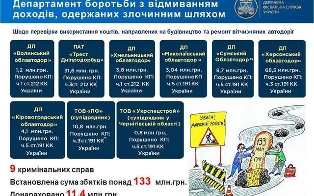 Также возбуждено 3 уголовных дела по статье 212 УК Украины (уклонение от уплаты налогов) в отношении действий должностных лиц ГП «Хмельницкий облавтодор», «Волынский облавтодор» и ПАО «Трест Днепродорстрой».