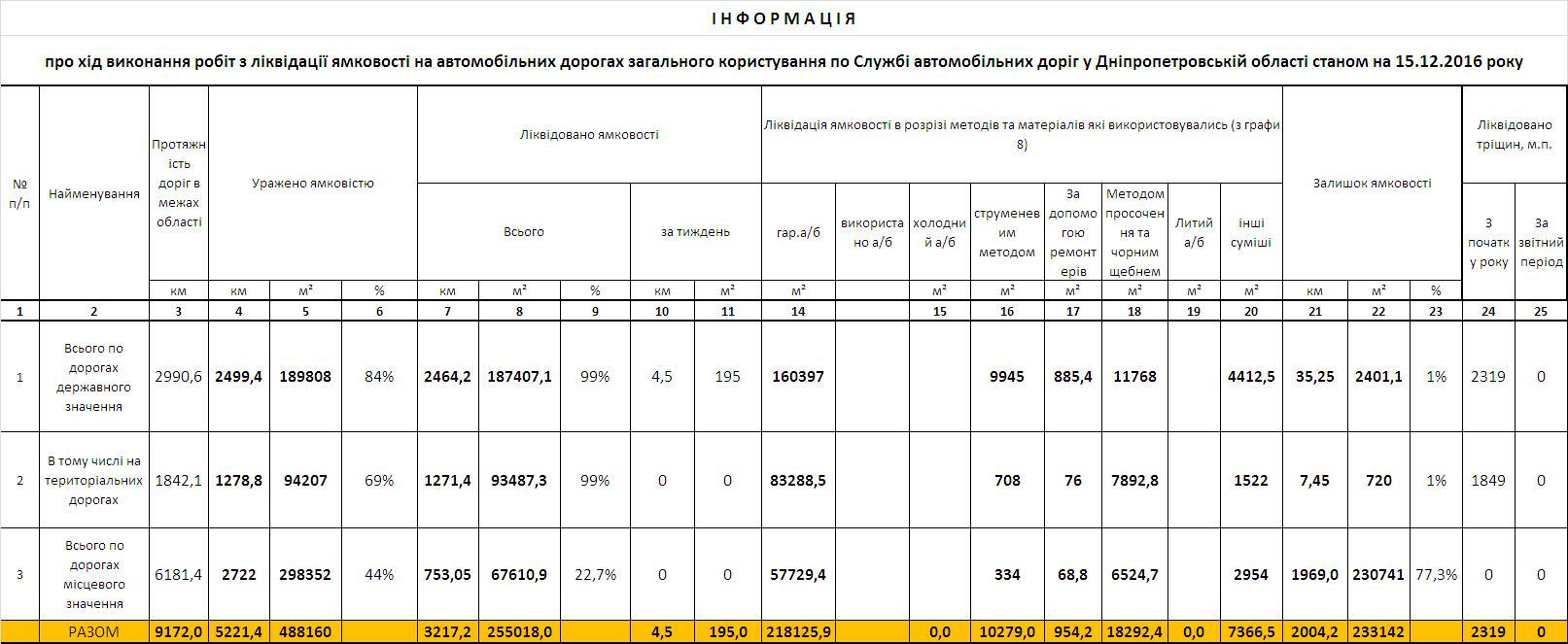 Напомним, что с начала года на дорогах общего пользования в Днепропетровской области ликвидировано 255018 кв.м. ям, в т.ч. на дорогах государственного значения -187407,1 кв м, а также на дорогах местного значения - 67610,9 кв.м.