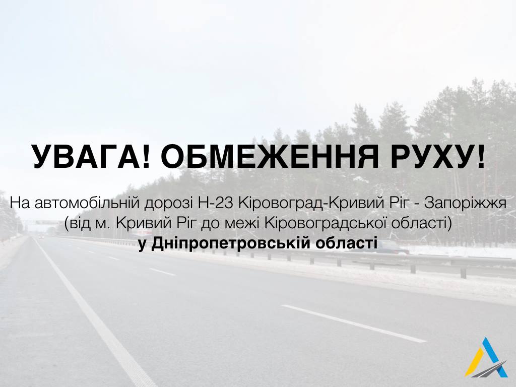 В связи со значительным ухудшением погодных условий и закрытием движения по автодороге Н-23 Кировоград - Кривой Рог - Запорожье на территории Кировоградской области, Служба автомобильных дорог в Днепропетровской области, которая является балансодержателем в соответствии с требованиями «Порядка временного ограничения или запрещения движения транспортных средств и других самоходных машин и механизмов на отдельных участках автодорог общего пользования», утвержденного Постановлением Кабинета Министров Украины от 27 июня 2007 года №879, принимает решение о закрытии движения для всех категорий транспорта.