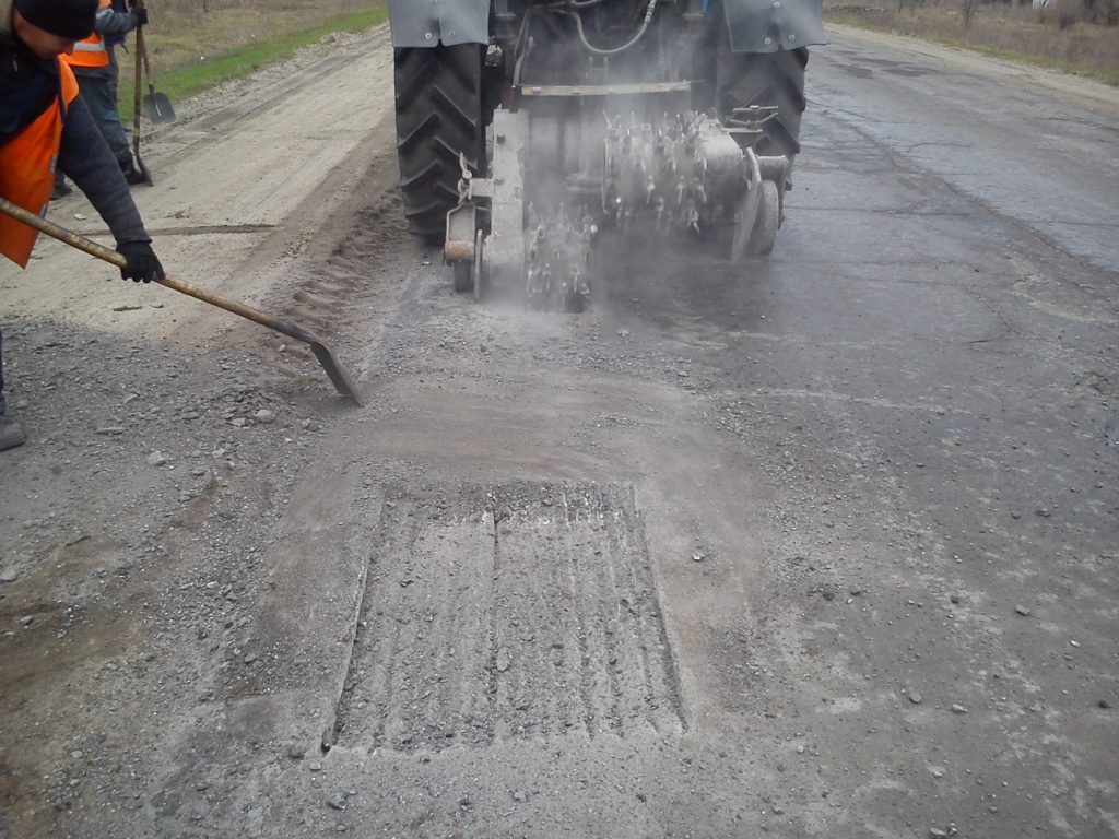 На фото - проводится ямочный ремонт на аварийных участках автодороги государственного значения Р-66 Демино-Александровка-Сватово-Лисичанск-Луганск.