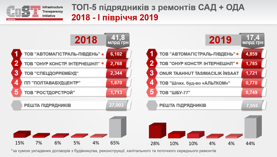 Как изменилась доля на рынке ТОП-5 подрядчиков по строительству и ремонтов дорог за I полугодие 2019 Агентство CoST (Construction Sector Transparency Initiative) регулярно отслеживает ситуацию на рынке дорожных работ в Украине.По сравнению с 2018 годом доля топов по сумме заключенных договоров по строительству, реконструкции, капитального и текущего среднего ремонтов увеличилась с 35% до 56%, то есть лидеры получили более половины подрядов на строительство и ремонт дорог в Украине. ООО «АВТОМАГИСТРАЛЬ-ЮГ» и ООО «ОНУР кон. ИНТЕРНЕШНЛ »не только закрепили первенство, а и увеличили свою долю с 15% на 28% и с 7% на 10% соответственно.Общая сумма подписанных областными службами автомобильных дорог контрактов, по данным CoST, в первом полугодии составляет 24330000000 грн.Напомним, что агентство CoST (Construction Sector Transparency Initiative) предназначена для обеспечения прозрачности и подотчетности строительства, осуществляемого за счет публичных средств.Основные мероприятия Инициативы направлены на обеспечение публичного доступа к информации по планированию, реализации и контроля за выполнением строительных проектов инфраструктуры, а также на верификацию достоверности и полноты этой информации. джерело
