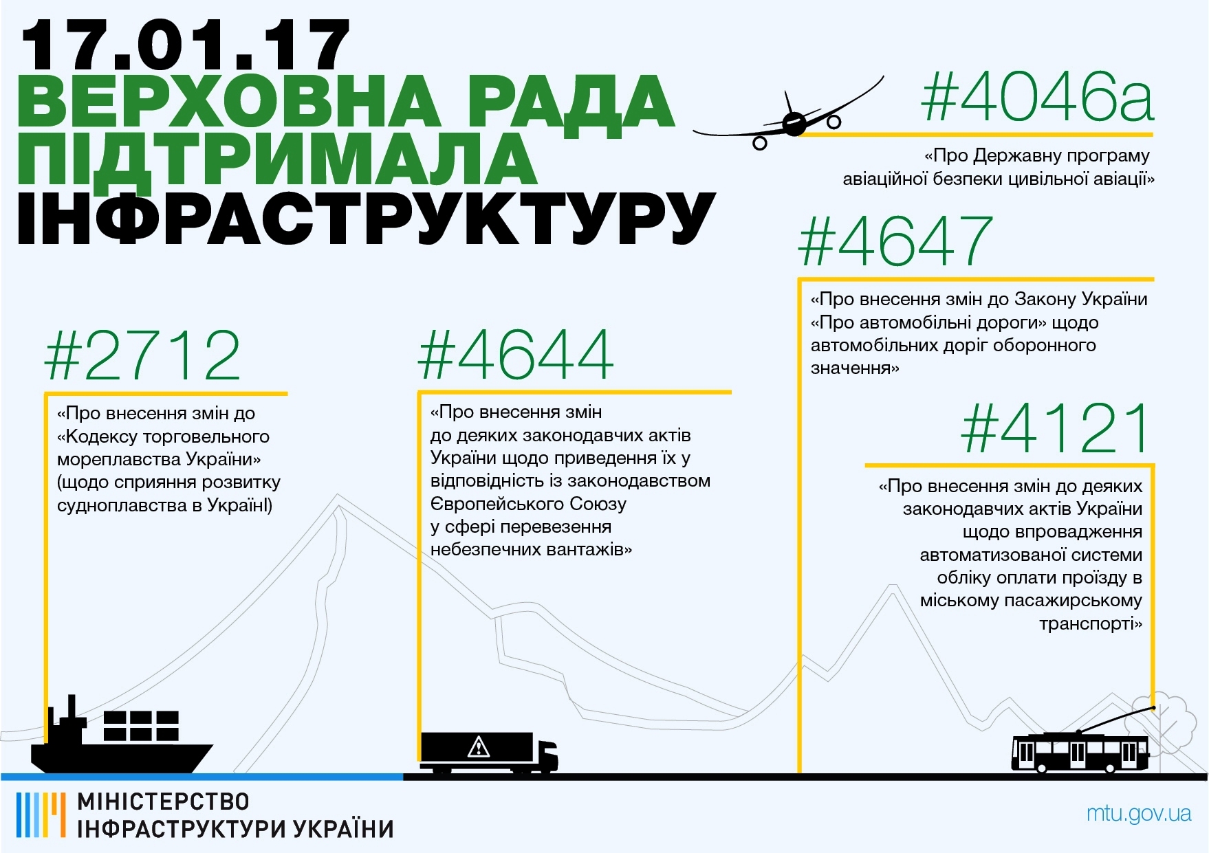 Законотворческая инициатива, поддержанная Верховной Радой Украины 17 января, направленна «на укрепление обороноспособности государства при введении правового режима военного положения, законодательное регулирование порядка использования автомобильных дорог оборонного значения в период действия военного положения и их технического прикрытия». Соответствующие изменения внесены в Закон Украины «Об автомобильных дорогах» (законопроектом № 4647). Нормативный документ дополнен статьей 51: «Автомобильными дорогами оборонного значения являются автомобильные дороги, необходимые для обеспечения обороны и безопасности Украины, соединения военных и других специальных объектов, предназначенных в условиях военного времени для военных перевозок, эвакуации населения, перевозок, связанных с эвакуацией грузов, народнохозяйственных перевозок. С целью обеспечения обороны и безопасности Украины автомобильные дороги независимо от их формы собственности и значения могут быть отнесены к автомобильным дорогам оборонного значения. Отнесение автомобильной дороги к автомобильным дорогам оборонного значения не является основанием для ограничения движения транспортных средств такой автомобильной дорогой, за исключением случаев ее использования в период действия военного положения. Порядок использования автомобильной дороги оборонного значения и ее восстановление в период действия военного положения, проведения мероприятий по ее технического прикрытия, а также перечень автомобильных дорог оборонного значения утверждаются Кабинетом Министров Украины». До внесения изменений автодороги делились на автомобильные дороги общего пользования; улицы и дороги городов и других населенных пунктов; ведомственные (технологические) автомобильные дороги и автодороги на частных территориях. В этой сфере правового регулирования действуют такие акты законодательства: Конституция Украины; Закон Украины «Об автомобильных дорогах»; Закон Украины «О функционировании единой транспортной системы в особый период»; Закон Украины «О передаче, принудительном отчуждении имущества или изъятия имущества в условиях правового режима военного времени»; Постановление Кабинета Министров Украины от 24.11.1997 № 1304-063 «Перечень автомобильных дорог оборонного значения на территории Украины»; Постановление Кабинета Министров Украины от 06.05.2009 № 466дск «Об утверждении Положения о техническом прикрытия и восстановление важнейших объектов и сооружений оборонного значения единой транспортной системы Украины в особый период». Кроме того, украинским парламентом принят еще ряд законопроектов, а именно: №4121 «О внесении изменений в некоторые законодательные акты Украины относительно внедрения автоматизированной системы учета оплаты проезда в городском пассажирском транспорте» (электронный билет) №2712 «О внесении изменений в «Кодекс торгового мореплавания Украины» (относительно содействия развитию судоходства в Украине); №4046а «О государственной программе авиационной безопасности гражданской авиации»; №4647 «О внесении изменений в Закон Украины «Об автомобильных дорогах» относительно автомобильных дорог оборонного значения»; №4644 «О внесении изменений в некоторые законодательные акты Украины относительно приведения их в соответствие с законодат